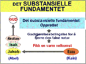For å legge fundamentet for Messias basert på Isaks familie måtte det substansielle fundamentet først etableres. Derfor måtte Isaks sønner Esau og Jakob atskilles og plasseres i henholdsvis Kains og Abels posisjon. Slik skulle de opprette godtgjørelsesbetingelsen for å fjerne den falne natur og komme med den substansielle offergave.