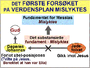 Døperen Johannes forlot abel-posisjonen. Derfor ble ikke det substansielle fundamentet opprettet. Dermed ble heller ikke fundamentet for Messias dannet, slik at det første forsøket på å gjenoppreise «Kanaan» på verdensplan mislyktes.