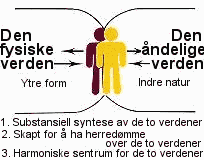 Mennesket består følgelig av et legeme som er begrenset og lever i nuet, og av et sinn som er ubegrenset og evig. Aktivitetsområdet for den begrensede kroppen er den synlige, substansielle verden. Det tilsvarende området for det ubegrensede, evige sinnet er den usynlige, substansielle verden. På samme måte som menneskets sinn er i handlingssubjekt- og årsaks-posisjon i forhold til kroppen, er den usynlige konkrete verden den motiverende verden i handlingssubjektposisjon overfor den synlige konkrete verden (Hebr 8,5).
