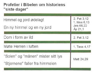 La oss nå se på forskjellige spørsmål angående menneskehetens histories "siste dager". Vi leser i Bibelen at himmelen skal forgå og elementene komme i brann i de siste dager (2. Pet 3,10). Det står også at solen skal "bli formørket og månen miste sitt lys. Stjernene skal falle ned fra himmelen" (Matt 24,29). De hellige skrifter forutsier videre at Kristus vil komme tilbake med støt i Guds basun, og "de som døde i troen på Kristus, skal først stå opp. Deretter skal vi som er blitt tilbake og fremdeles lever, sammen med dem bli rykket opp i skyene, i luften, for å møte Herren" (1. Tess 4,16-17).