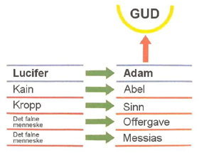Nå var Kain og Abel begge Adams kjøtt og blod. Hvem av de to representerte da det gode og sto i en posisjon som medførte at vedkommende kunne ha et forhold til Gud? Hvem var det ondes representant, som måtte stå i en posisjon som gjorde at vedkommende fikk et forhold til Satan?
