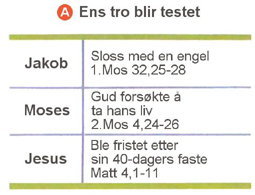 1. Adam og Eva holdt ikke Guds bud og kunne følgelig ikke gå seierrike ut av den prøvelse som erkeengelens fristelse utgjorde. Dermed falt de. For nettopp å godtgjøre det mislykte resultatet av prøvelsen Adam og Eva gjennomgikk, sloss Jakob med fare for sitt liv med en engel ved Jabboks vadested. Jakob seiret og fikk dermed navnet Israel (1. Mos 32,25-28). Gud testet Jakob ved å plassere engelen i Satans posisjon. Hensikten var imidlertid ikke å føre Jakob ut i ulykke og elendighet. Prøvelsen skulle tvert imot kvalifisere Jakob som den som kunne fullføre gjenoppreisningen på familieplan, ved at han gjenopprettet herredømmet over englene.