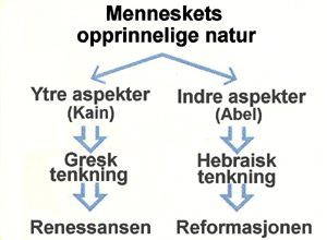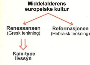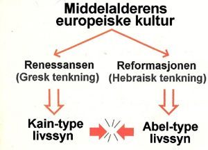 Først oppsto en kain-type bevegelse, som søkte å gjenopplive gresk tenkning. Deretter kom en abel-type bevegelse for å vende tilbake til hebraisk tenkning. Bevegelsen for å gjenopplive gresk tenkning ble kjent som renessansen. Den la vekt på humanistiske verdier som naturens skjønnhet, individets frihet og det jordiske livs verdi. Bevegelsen for å reintrodusere hebraisk tenkning kom til uttrykk gjennom reformasjonen. Ved å vende tilbake til Gud og Bibelens egne ord søkte denne bevegelsen å finne tilbake til den ånd de første kristne hadde.