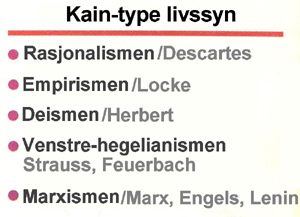På 1700-tallet utviklet kain-type livssynet seg til det vi kaller opplysningstidens tenkning. Da ble eksisterende tradisjoner vraket. Alle aspekter ved livet ble vurdert ut fra fornuft og realisme. Derfor forkastet opplysningstidens tenkning fullstendig fenomener som virket ulogiske, fornuftsstridige eller uvirkelige. En virkelighetsoppfatning basert på fornuft og logikk var det eneste man la vekt på. På denne måten gjorde ikke mennesket seg bare uavhengig av Gud, men gikk langt videre og forkastet Gud.
