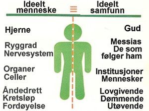 Som forklart i Skapelsesprinsippene ble den skapte verden skapt med strukturen til det fullkomne menneske som mønster (norm). Gud må likeledes ha planlagt ideelle samfunn, som består av fullkomne mennesker, og som skulle ligne på strukturen og funksjonene til et fullkomment menneske. På samme måte som samtlige organer og celler i menneskekroppen fungerer i samsvar med hjernens direktiver, skulle samtlige institusjoner og mennesker i et ideelt samfunn fungere og eksistere i samsvar med Guds vilje. Ingen del av menneskekroppen forkaster hjernens direktiver. Det burde likeledes heller ikke være vanskelig for oss mennesker å leve i samsvar med Guds vilje på en helt naturlig måte. På samme måte som hjernens impulser formidles til alle deler av kroppen gjennom sentralnervesystemet og det perifére nervesystemet, vil Guds retningslinjer nå ut til alle deler av samfunnet gjennom Messias, som kommer som en Sann far, og hans disipler (de som følger ham).
