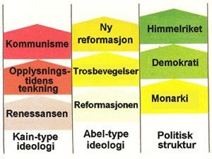 Også på det politiske område kan vi se en revolusjonær utvikling som har gått gjennom tre stadier. Den første renessanse og den første religiøse reformasjon resulterte i at middelalderens feudalsamfunn gikk i oppløsning. Den andre renessanse og den andre religiøse reformasjon førte til eneveldets (det absolutte monarkis) fall. Den kommunistiske verden oppsto som en verden på Satans side på grunn av den politiske revolusjonen som den tredje renessanse skapte. Gjennom den tredje religiøse reformasjon må nå den demokratiske verden på Guds side, ved hjelp av ideologiske midler, få den kommunistiske verden til å underkaste seg. Da kommer vi til å oppleve en forent verden, som vil bli Guds rike på jorden.
