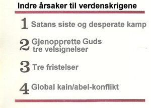 Kriger bryter vanligvis ut av politiske, økonomiske og ideologiske årsaker. Men i tillegg til slike åpenbare årsaker på det ytre plan finnes også indre årsaker, dvs årsaker som har med Guds gjenoppreisningsarbeid gjennom godtgjørelse å gjøre. Den grunnleggende årsaken til verdenskrigene er konflikten mellom Satans onde herredømme og Guds gode herredømme. Det er en konflikt der mennesket er fanget i midten. Satan vil ikke gi slipp på mennesket, mens Gud ønsker å bringe mennesket over på sin side og gjenoppreise det. La oss se nærmere på dette.