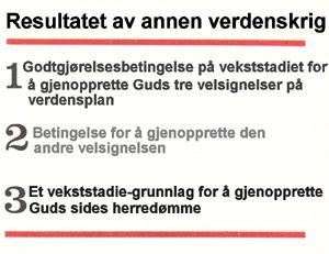 Den annen verdenskrig endte med seier for nasjonene på Guds side. Dermed kunne en godtgjørelsesbetingelse, som representerte vekststadiet, bli etablert for å gjenoppreise Guds tre velsignelser på verdensplan. Den annen verdenskrig representerte dessuten opprettelsen av en godtgjørelsesbetingelse for globalt å overvinne den andre av Satans tre fristelser til Jesus. Denne fristelsen har med Guds andre velsignelse å gjøre, dvs. at det godes sønner og døtre blir mange (1. Mos 1,28). Etter krigen hadde derfor forberedelsene for Gjenkomsten nådd det stadium der troende kunne bli gjenoppreist som Guds sanne sønner og døtre. Seieren i annen verdenskrig utgjorde dessuten et vekststadie-fundament for å gjenopprette Guds herredømme.