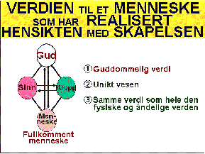 Et fullkomment menneske har samme guddommelige natur som Gud. Et fullkomment menneske er et unikt vesen selv i en kosmisk sammenheng, dvs både i den fysiske og den åndelige verden. Et fullkomment menneske har i tillegg samme verdi som hele den fysiske og den åndelige verden. Et slikt menneske har altså den høyest tenkelige verdi. Uansett hvor stor verdi Jesus har, kan han umulig ha en verdi større enn et menneske som har realisert skapelseshensikten (1. Tim 2,5).