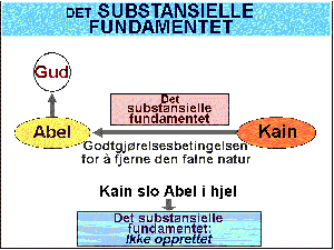Kain slo imidlertid Abel i hjel. Vi fikk med andre ord dermed en repetisjon av erkeengelens synd da han fikk mennesket til å falle. Kain demonstrerte altså tydelig hovedtrekkene ved den falne natur. Slik ble det substansielle fundamentet i Adams familie ikke realisert.