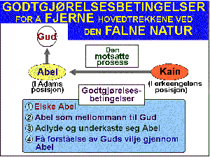 For at det substansielle fundament skulle bli lagt i Adams familie, måtte Kain opprette en godtgjørelsesbetingelse for å fjerne sin falne natur ved å adlyde og underkaste seg Abel. Da ville Gud gladelig ha kunnet akseptere Kains offergave.