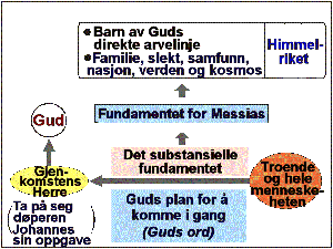 Døperen Johannes forlot abel-posisjonen. Derfor ble ikke det substansielle fundamentet opprettet. Dermed ble heller ikke fundamentet for Messias dannet, slik at det første forsøket på å gjenoppreise «Kanaan» på verdensplan mislyktes.