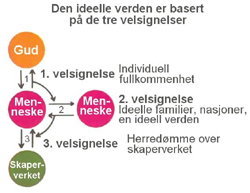 2) Guds ideelle verden er en verden der mennesket har oppfylt de tre velsignelsene som vi beskrev i Skapelsesprinsippene, seksjon 3.3. Gud skapte oss mennesker for at vi skulle oppnå individuell fullkommenhet (velsignelse nr. 1), utvikle ideelle familier og samfunn (velsignelse nr. 2) og skape ideelle omgivelser (velsignelse nr. 3). Dette er Guds opprinnelige hensikt med å skape. Gud har aldri gitt opp å få denne hensikten realisert. Derfor har han arbeidet gjennom historien for å legge forholdene til rette for at de tre velsignelsene skal bli gjenoppreist.