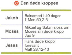 3. På grunn av syndefallet har Satans herredømme over mennesket til og med omfattet menneskets døde kropp. Jakobs legeme ble imidlertid balsamert i førti dager og sørget over (1. Mos 50,2-3). Derfor var hans kropp allerede velsignet og helliggjort. Dermed ble en betingelse opprettet for at selv hans døde kropp kunne atskilles fra Satan.