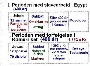 Perioden med slavearbeid i Egypt var et resultat av Abrahams mislykte offer. Det er perioden da Jakobs 12 sønner og familie på 70 personer dro til Egypt, som representerte den satanske verden. Deres etterkommere led forferdelig under egypterne. Perioden med forfølgelse i Romerriket var et resultat av at jødene feilet i å tro på Jesus. Det er perioden da Jesu 12 apostler, 70 disipler og de første kristne opplevde en forferdelig forfølgelse i Romerriket, som representerte den satanske verden.