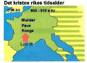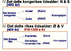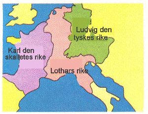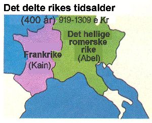 Det kristne rike som begynte med Karl den store, ble også delt. Det ble først delt i tre deler [9] - det østfrankiske riket (Ludvig den tyskes [10] rike), det vestfrankiske riket (Karl den skalletes [11] rike) og det mellomste riket (Lothars [12] rike). Dette skjedde på grunn av motsetningene mellom Karl den stores sønnesønner. Da Henrik I [13] ble konge i Øst-Franken i år 919, begynte det delte kristne rikes tidsalder. Italia kom snart under østfrankisk herredømme. Riket ble da delt i det østfrankiske riket (det tysk-romerske rike, som senere ble kalt Det hellige romerske rike [14]) og det vestfrankiske riket (Frankrike). Østriket var i abel-posisjon og vestriket i kain-posisjon.