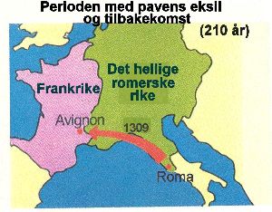 I 1377 flyttet pave Gregor XI [27] pavestolen tilbake til Roma. I de etterfølgende 140 årene var det stor forvirring i kirken [28]. En tid fantes det til og med tre paver som regjerte samtidig. De omtrent 140 årene det tok paven i Roma å gjenvinne absolutt kontroll over kirken, dvs. tiden fram til den religiøse reformasjonen, utgjør perioden med pavens tilbakekomst etter sitt eksil.