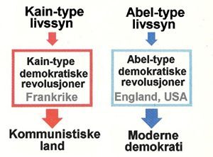 Kain-type demokratier ble opprettet gjennom en kamp på det ytre plan, der man tok i bruk vold, noe den franske revolusjonen [33] var et typisk eksempel på. Slike former for demokrati utviklet seg på grunn av opplysningstidens tenkning, som hadde som mål å realisere frihet, likhet og brorskap [34] . Abel-type demokratier, derimot, ble opprettet basert på seire på det indre plan og seire for forkjemperne for religiøs frihet. Det var flere eksempler på dette: demokratiene i England, USA og flere andre land. Dette forklarer hvorfor revolusjonene i England [35] og USA [36] fikk en mer human form. Ut fra disse to typene demokrati utviklet henholdsvis den kommunistiske og den demokratiske verden seg.