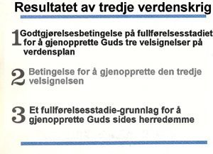 Skulle den tredje verdenskrig ende med seier for Guds side, vil nok globale godtgjørelsesbetingelser ha blitt opprettet til å gjenoppreise Guds tre velsignelser. Dessuten vil en seier være en betingelse som betyr at menneskene på Guds side globalt har overvunnet Satans tredje fristelse til Jesus. Videre vil et komplett fundament ha blitt opprettet for å gjenoppreise Guds herredømme gjennom godtgjørelse.